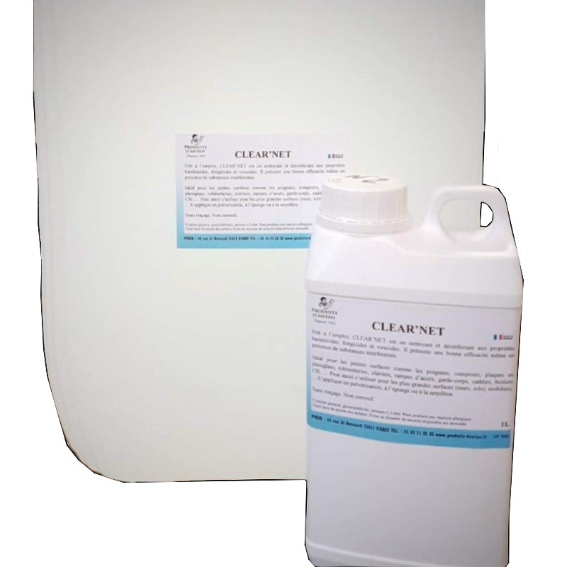 CLEAR’NET, prêt à l'emploi est un nettoyant, désinfectant aux propriétés bactéricides, fongicides et virucides. Il présente une bonne efficacité même en présence de substances interférentes. Idéal pour les petites surfaces comme les poignées, comptoirs, plaques en plexiglass, robinetteries, claviers, rampes d’accès, garde-corps, caddies, boitier CB, … Peut aussi s’utiliser pour les plus grandes surfaces (murs, sols), mobiliers, …